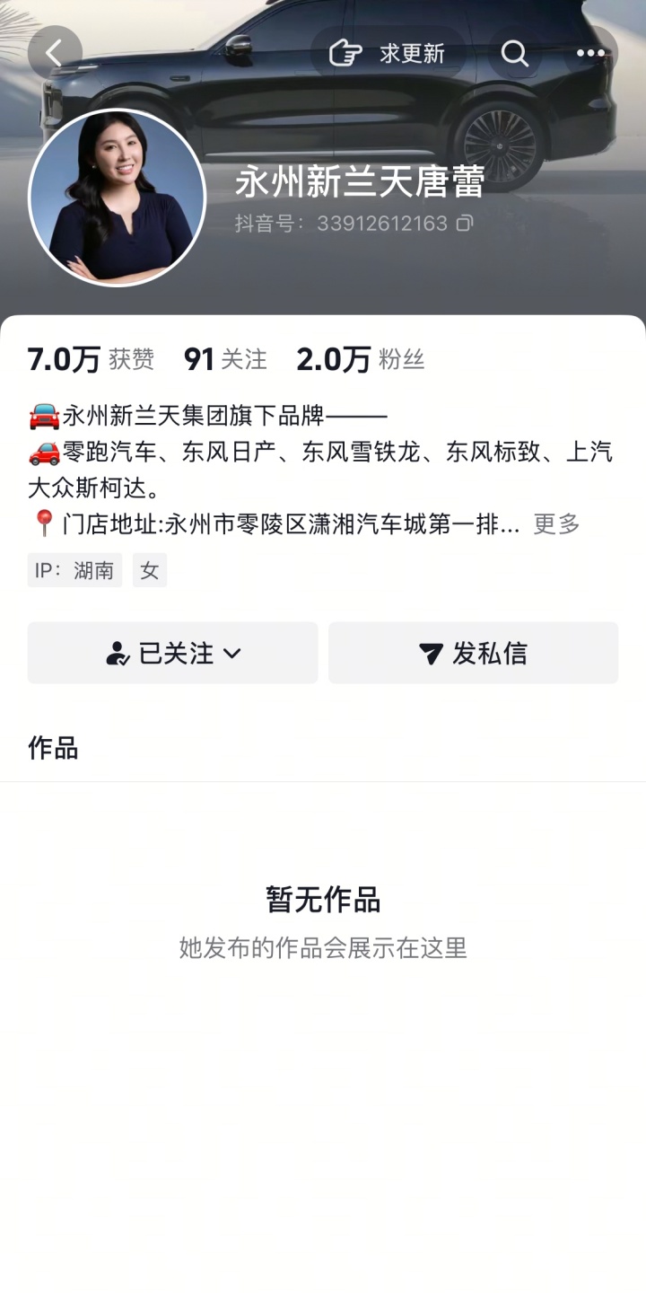 永州队问鼎湘超冠军,但车行女雇主的赠车快活暂未完了,最新音书是,“榜一姐姐”清空了抖音平合统共视频。