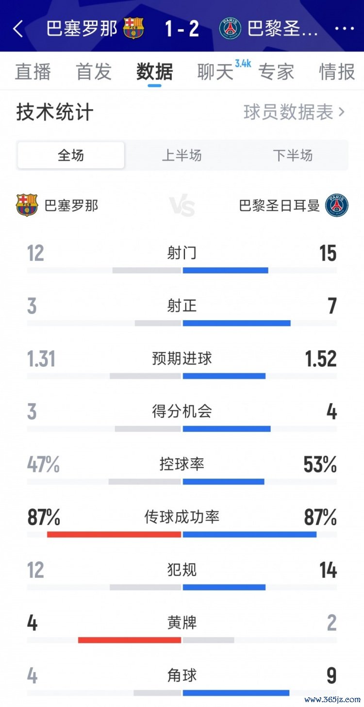 10月2日讯 在本轮欧冠,巴黎2-1打败巴萨。以下为两边全场数据对比: