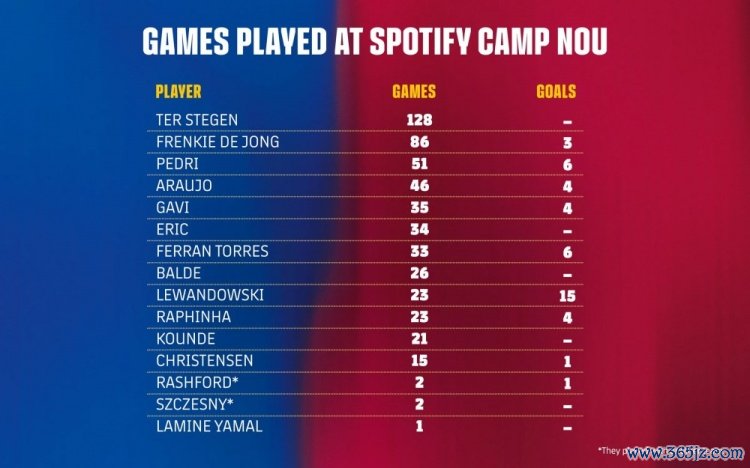 巴萨官方统计现时队内球员在诺坎普出场榜:*为仅曾代表客队在诺坎普出场