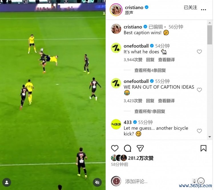 C罗赛后更新社媒动态,晒出我方倒钩破门的视频,与球迷互动:“最好配文由你们定。”