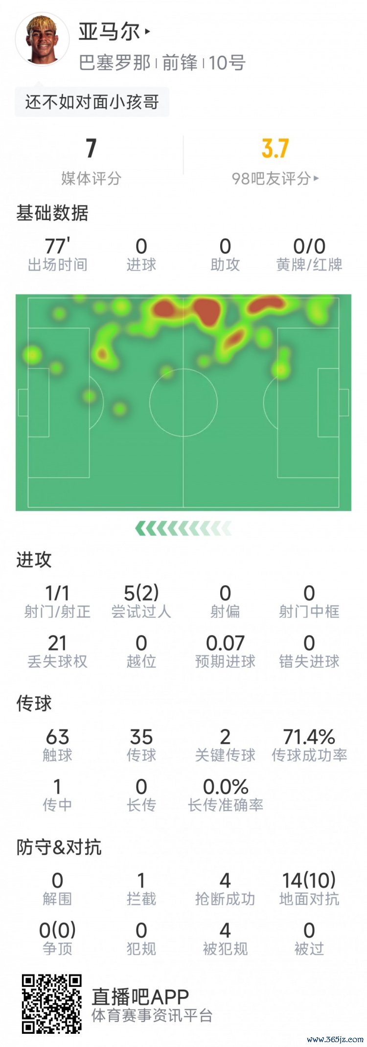 11月26日讯 在本轮欧冠切尔西对阵巴萨的比赛中,亚马尔首发登场,以下为他在本场数据: