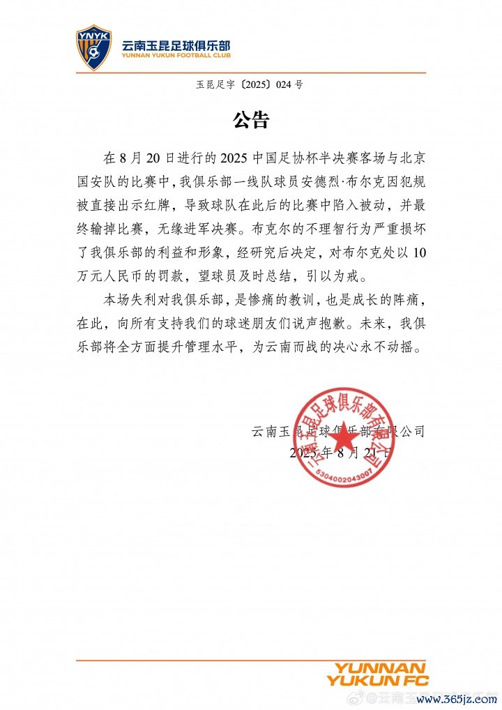 在8月20日进行的2025中国足协杯半决赛客场与北京国安队的比赛中,我俱乐部一线队球员安德烈-布尔克因犯规被告成出示红牌,导致球队在尔后的比赛中堕入被迫,并最终输掉比赛,无缘辛劳决赛。布尔克的不睬智举止严重损坏了我俱乐部的利益和形象,经究诘后决定,对布尔克处以10万元东说念主民币的罚金,望球员实时回来,引认为戒。