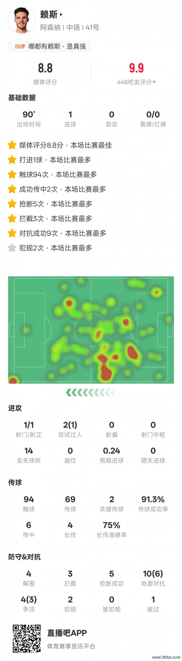 11月2日讯 2025-26赛季英超联赛第10轮,阿森纳客场2-0伯恩利。赖斯首发出战,1射门1射正打进1球,另外他还有2次要津传球,4次突围,3此羁系和5次抢断,评分8.8全场最高。