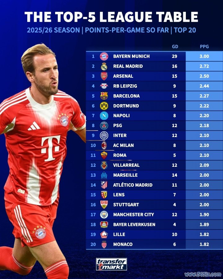 11月08日讯 德转统计了新赛季于今五大联赛球队的场均积分榜,其中拜仁全胜场均3分排在榜首,皇马、阿森纳分列二三。