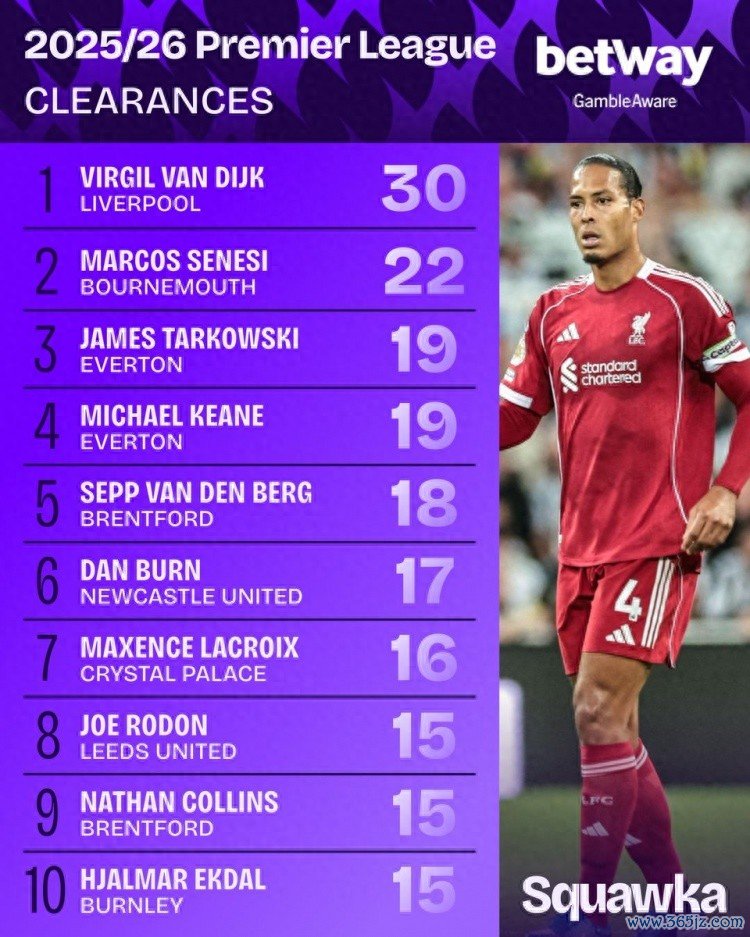 直播吧8月28日讯 新赛季英超两轮战罢,据Squawka的数据统计,利物浦中卫范迪克在两场比赛中共有30次突围,在扫数球员中最多。