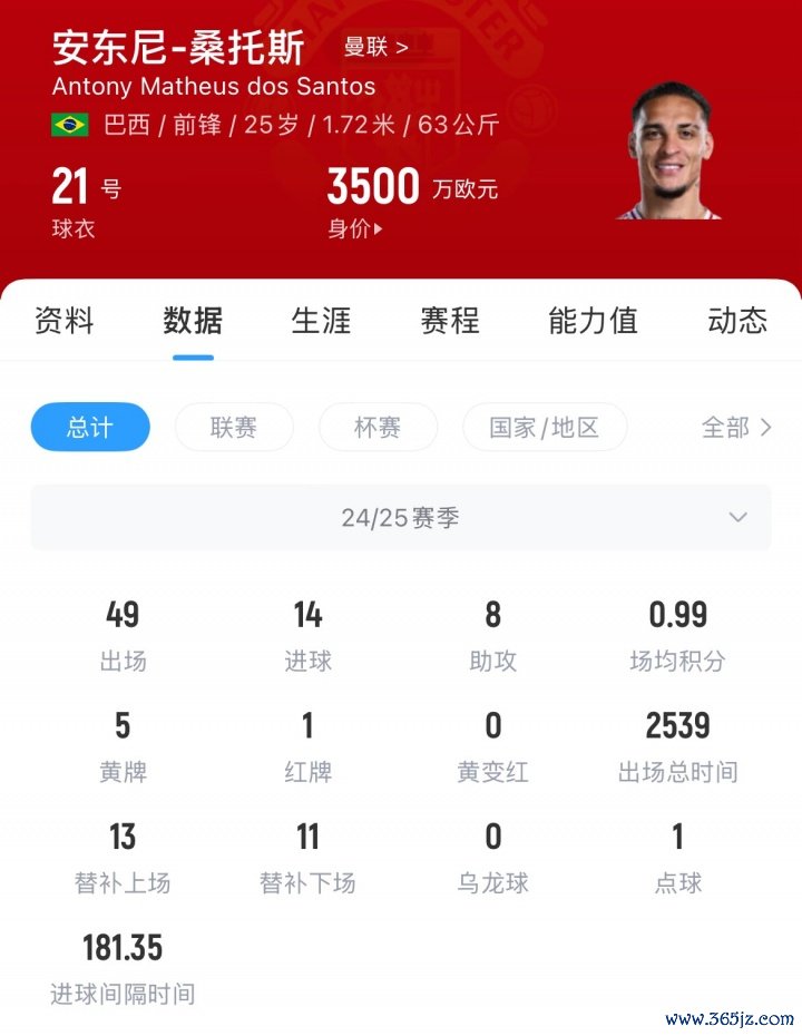 安东尼上赛季各赛事共出战49场,打进14球助攻8次。租赁贝蒂斯本领,安东尼屡次示爱贝蒂斯,抒发留住意愿。