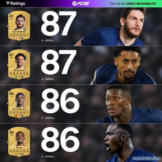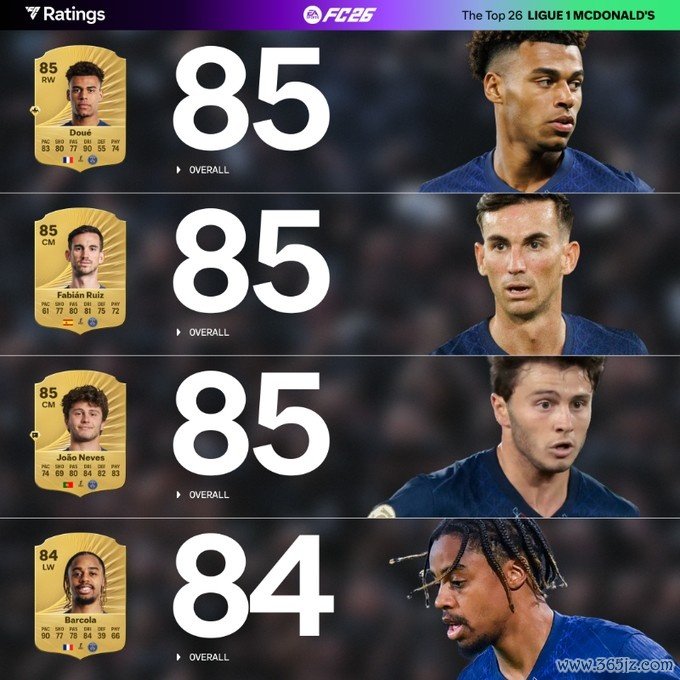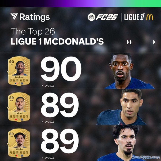 9月13日讯 FC26公布了法甲球员评分榜,其中登贝莱居首,具体如下: