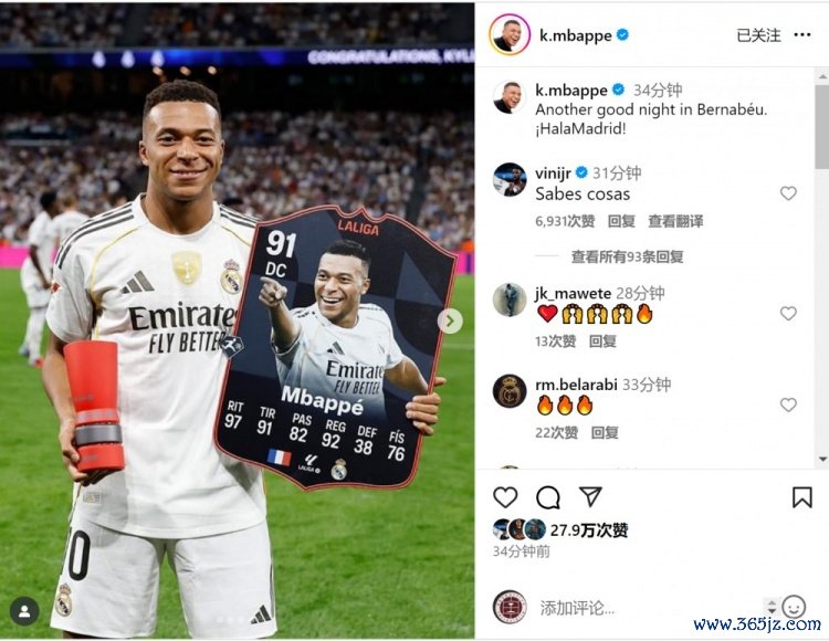 姆巴佩更新社媒动态,晒出赛前领取西甲9月最好球员奖杯的相片,配文:“又一个精巧的伯纳乌之夜,Hala Madrid!”