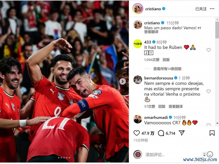 C罗社媒晒出与队友们一皆庆祝的相片,并配文:“又迈出一步!加油!”