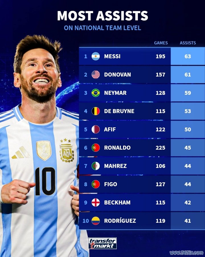 10月15日讯 德转本日统计了球员国度队历史助攻榜,其中梅西63次助攻位列榜首,多诺万、内马尔分列二三,C罗45助第6。