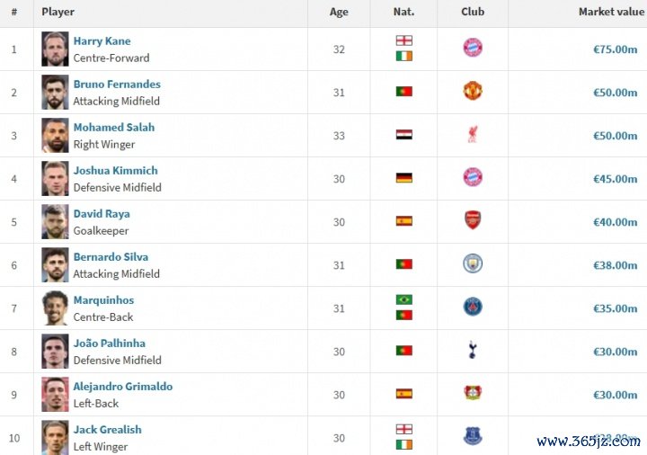 10月15日讯 昨日德转更新德甲球员身价,32岁的凯恩身价莫得变化,仍为7500万欧。尽管身价莫得提高,凯恩在现役30岁以上球员的身价排名中仍断档卓越。