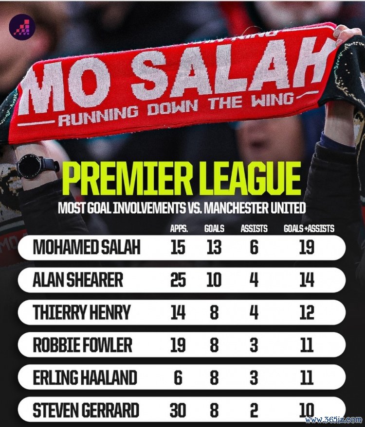 10月17日讯 北京时刻10月19日晚上,利物浦将在英超第8轮比赛中主场对阵曼联,Squawka统计了球员在对阵曼联的英超比赛中的参与进球数目,萨拉赫19球居首。