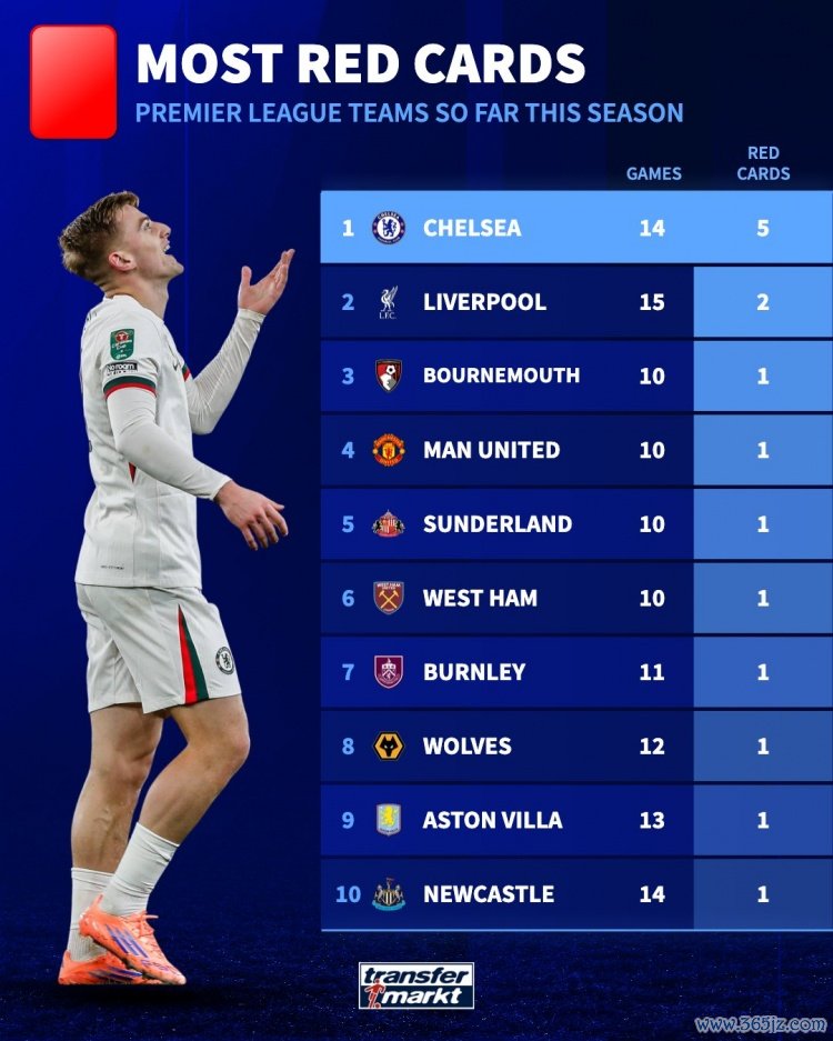 10月30日讯 英超已赛9轮,现在阿森纳以4分上风领跑积分榜。据德转数据统计,边界现在,英超球队在各项赛事红牌榜中,切尔西以5张红牌遥遥逾越,利物浦2红名轮番2。