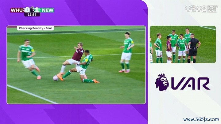 比赛第11分钟,佳夫犯规送点,经VAR介入,主裁场边不雅看回放后阐发佳夫触球,点球取消,纽卡仍1-0杰出西汉姆。