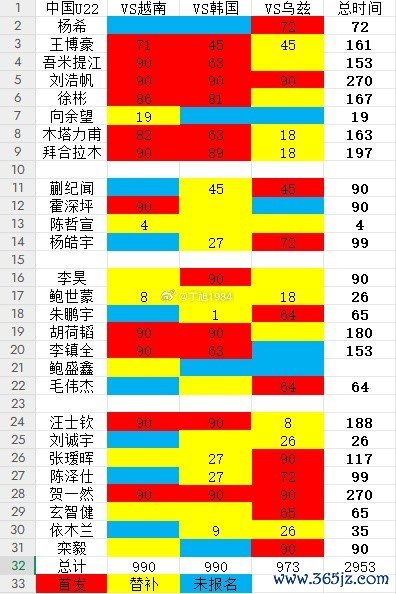 11月18日讯 在本届熊猫杯赛事限度后,记者丁旭统计了中国U22球员在赛事中的出场时辰,其中刘浩帆、贺一然两东说念主打满了沿途的三轮比赛。