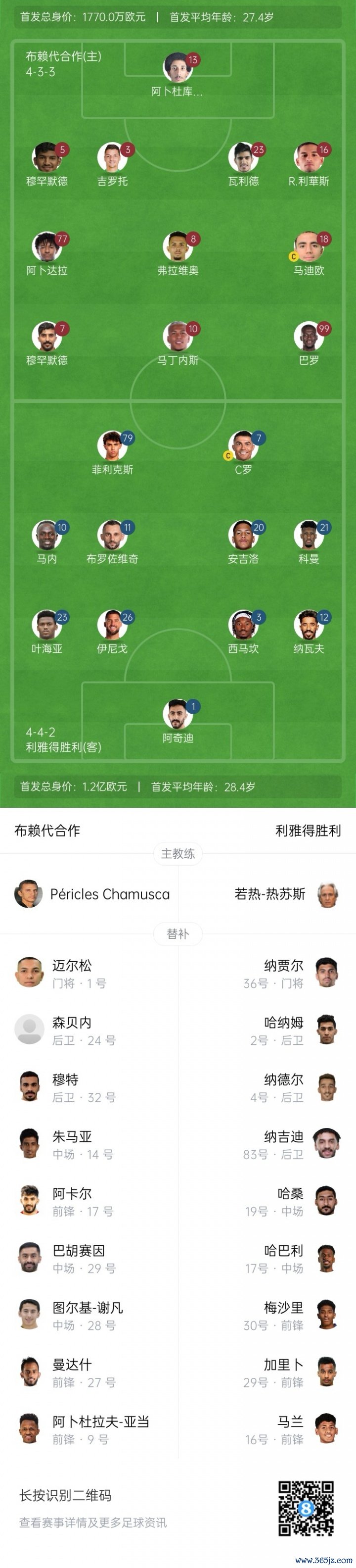 布赖代互助首发:13-阿卜杜库多斯、16-利华斯、23-瓦利德、3-吉罗托、5-马扎里、18-马迪欧、8-弗拉维奥、77阿卜达拉、99-巴罗、10-罗杰-马丁内斯、7阿尔库维基比
