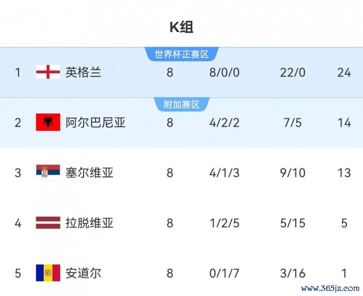 K组:英格兰头名纵贯正赛,阿尔巴尼亚第2将参加附加赛