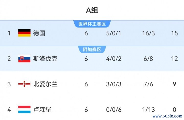 A组:德国头名纵贯正赛,斯洛伐克第2将参加附加赛,北爱尔兰凭借欧国联收成插足附加赛