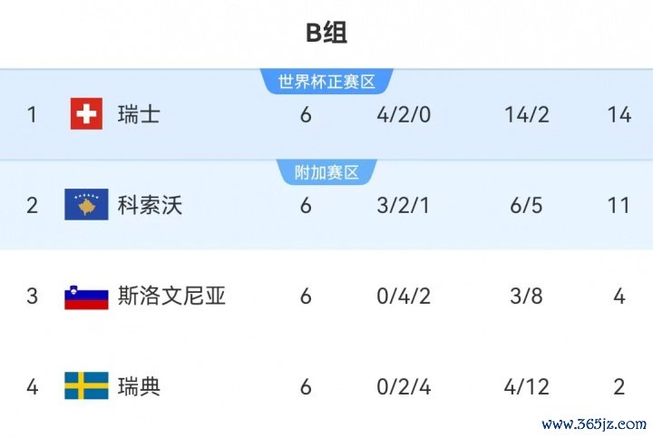 B组:瑞士头名纵贯正赛,科索沃第2将参加附加赛,瑞典凭借欧国联收成插足附加赛