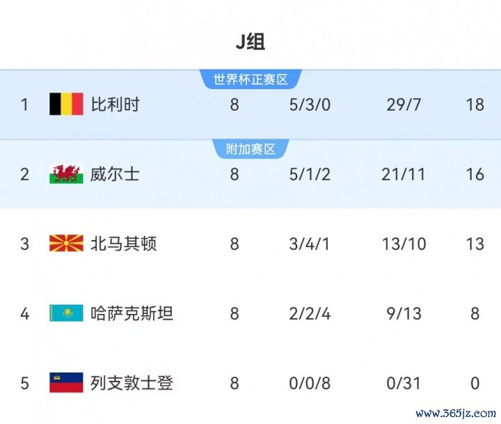 J组:比利时头名纵贯正赛,威尔士第2将参加附加赛,北马其顿凭借欧国联收成插足附加赛