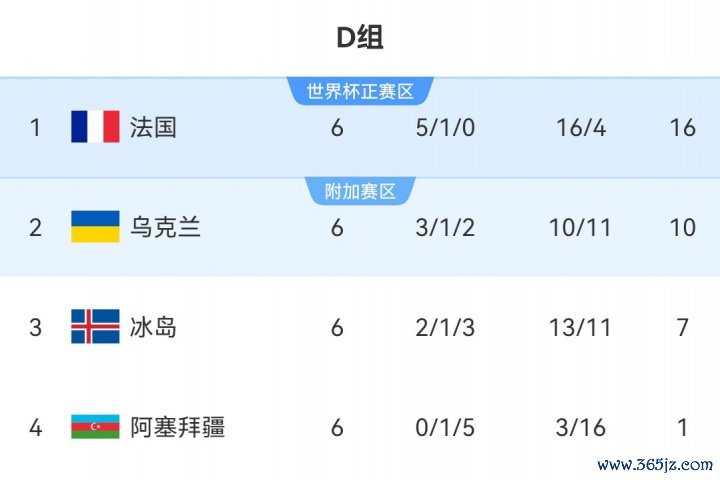D组:法国头名纵贯正赛,乌克兰第2将参加附加赛