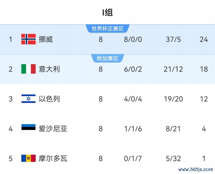 I组:挪威头名纵贯正赛,意大利第2将参加附加赛