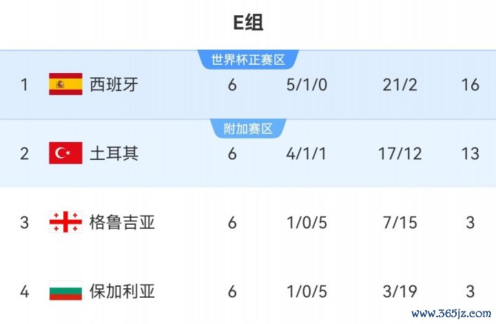 E组:西班牙头名纵贯正赛,土耳其第2将参加附加赛