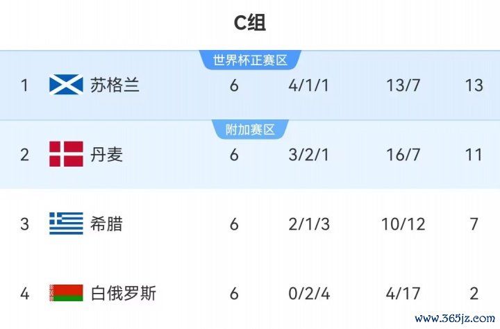 C组:苏格兰头名纵贯正赛,丹麦第2将参加附加赛