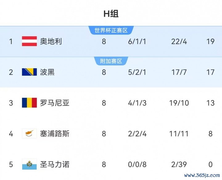 H组:奥地利头名纵贯正赛,波黑第2将参加附加赛,罗马尼亚凭借欧国联收成插足附加赛