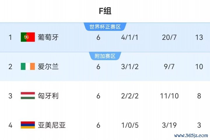 F组:葡萄牙头名纵贯正赛,爱尔兰第2将参加附加赛
