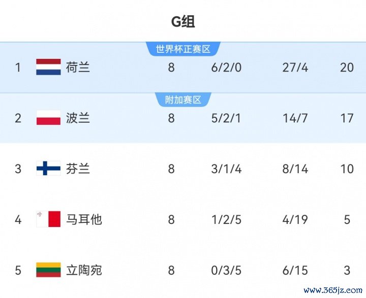G组:荷兰头名纵贯正赛,波兰第2将参加附加赛