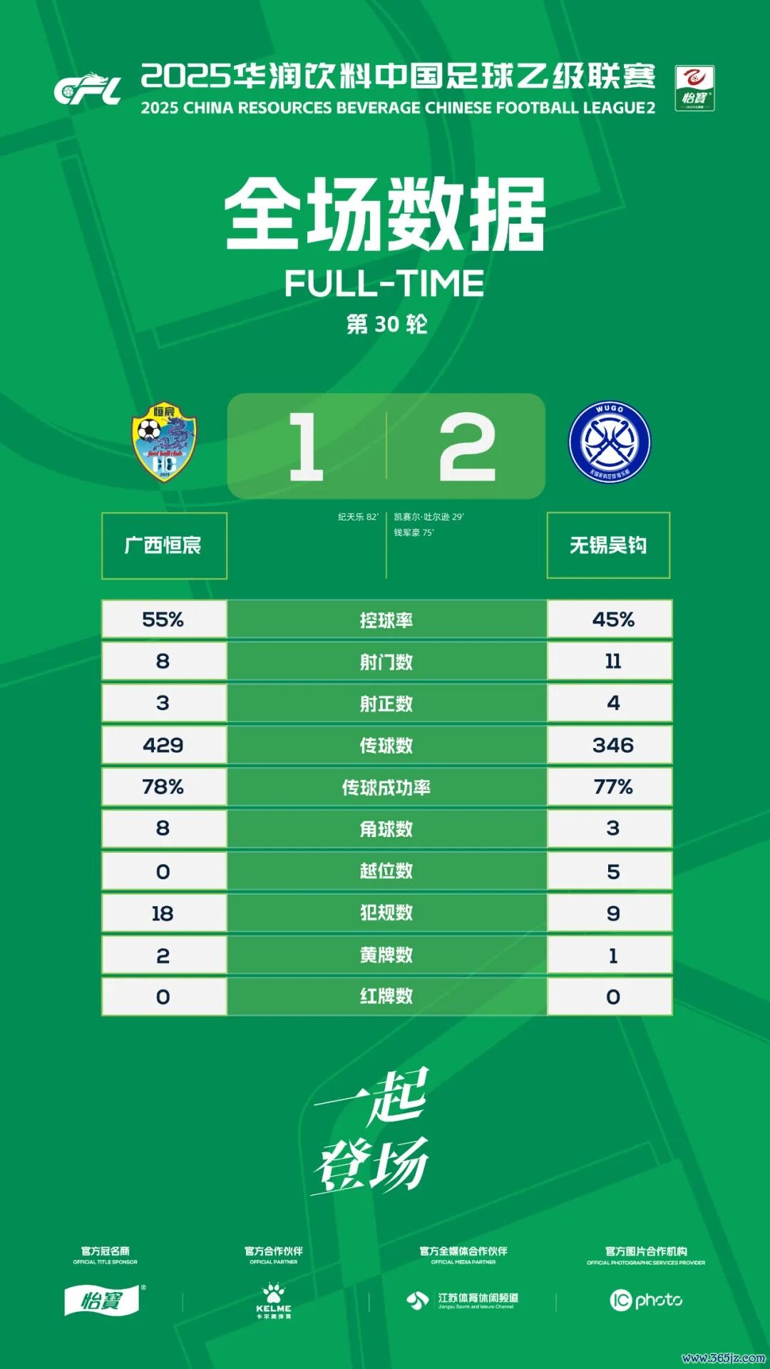 10月26日14:30,2025华润饮料中乙联赛第30轮第二比赛日,广西恒宸对阵无锡吴钩的比赛在广西体育中心进行。广西恒宸的纪天乐破门,无锡吴钩的凯赛尔·吐尔逊、钱军豪各入一球。最终,广西恒宸1-2不敌无锡吴钩。