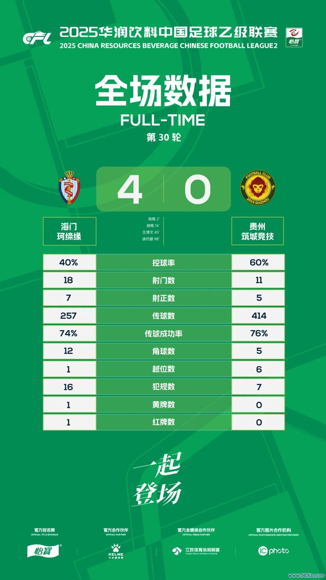 10月26日14:30,2025华润饮料中乙联赛第30轮第二比赛日,海门珂缔缘对阵贵州筑城竞技的比赛在海门体育中心通顺场进行。海门珂缔缘的阎格演出梅开二度,王博文、徐约瑟各入一球。最终,海门珂缔缘4-0征服贵州筑城竞技。
