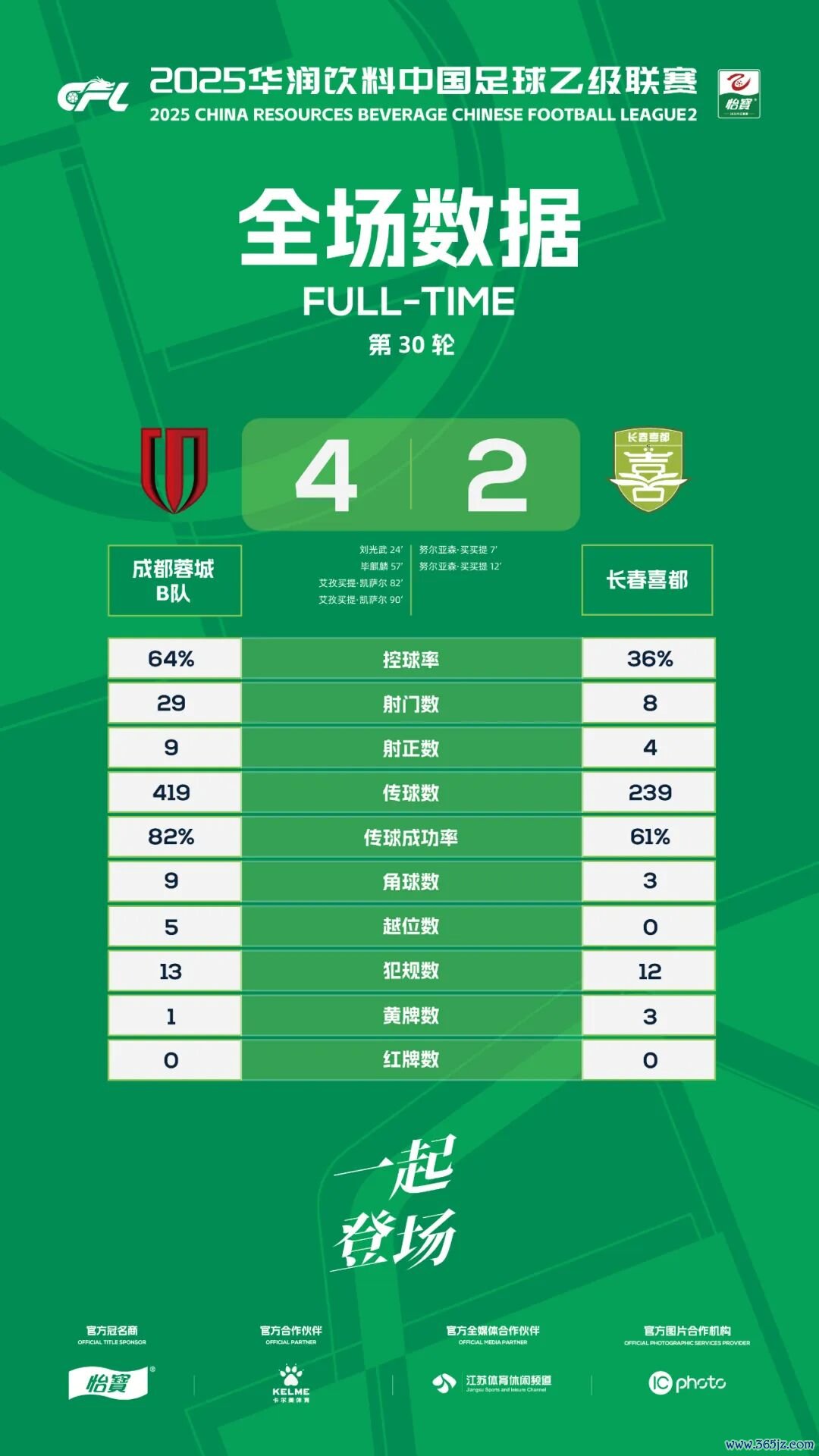 10月26日14:30,2025华润饮料中乙联赛第30轮第二比赛日,成都蓉城B队对阵长春喜都的比赛在双流体育中心进行。成都蓉城B队的艾孜买提·凯萨尔演出梅开二度,刘光武、毕麒麟各入一球;长春喜都的努尔亚森·买买提演出梅开二度。最终,成都蓉城B队4-2征服长春喜都。