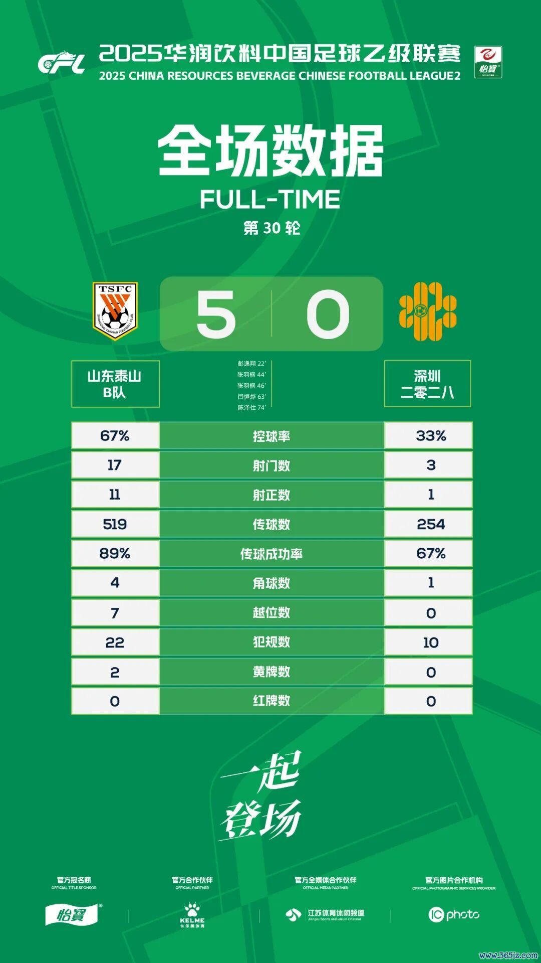 10月26日14:30,2025华润饮料中乙联赛第30轮第二比赛日,山东泰山B队对阵深圳二零二八的比赛在邹城市体育中心进行。山东泰山B队的张羽桐演出梅开二度,彭逸翔、闫恒烨、陈泽仕各入一球。最终,山东泰山B队5-0征服深圳二零二八。